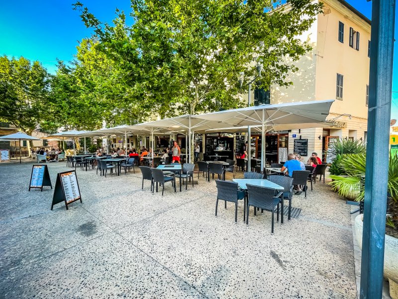 Acogedor café en la plaza de Capdepera, bajo la sombra de frondosos árboles y con encanto tradicional. Un lugar ideal para disfrutar al aire libre en un ambiente tranquilo y mediterráneo.